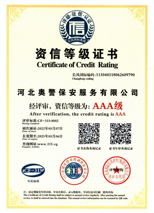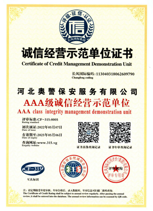 河北奧警保安服務有限公司成立于2017年7月20日,注冊資金1000萬元,具有中華人民共和國《保安服務許可證》(編號:冀公保服20180085)的綜合性安保企業(yè)。