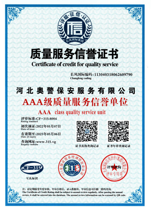 “忠誠的伙伴,非凡的朋友”,河北奧警保安服務有限公司本著“客戶的需求就是我們的追求”的服務理念,與廣大客戶攜手并進、共創(chuàng)恢弘偉業(yè)。